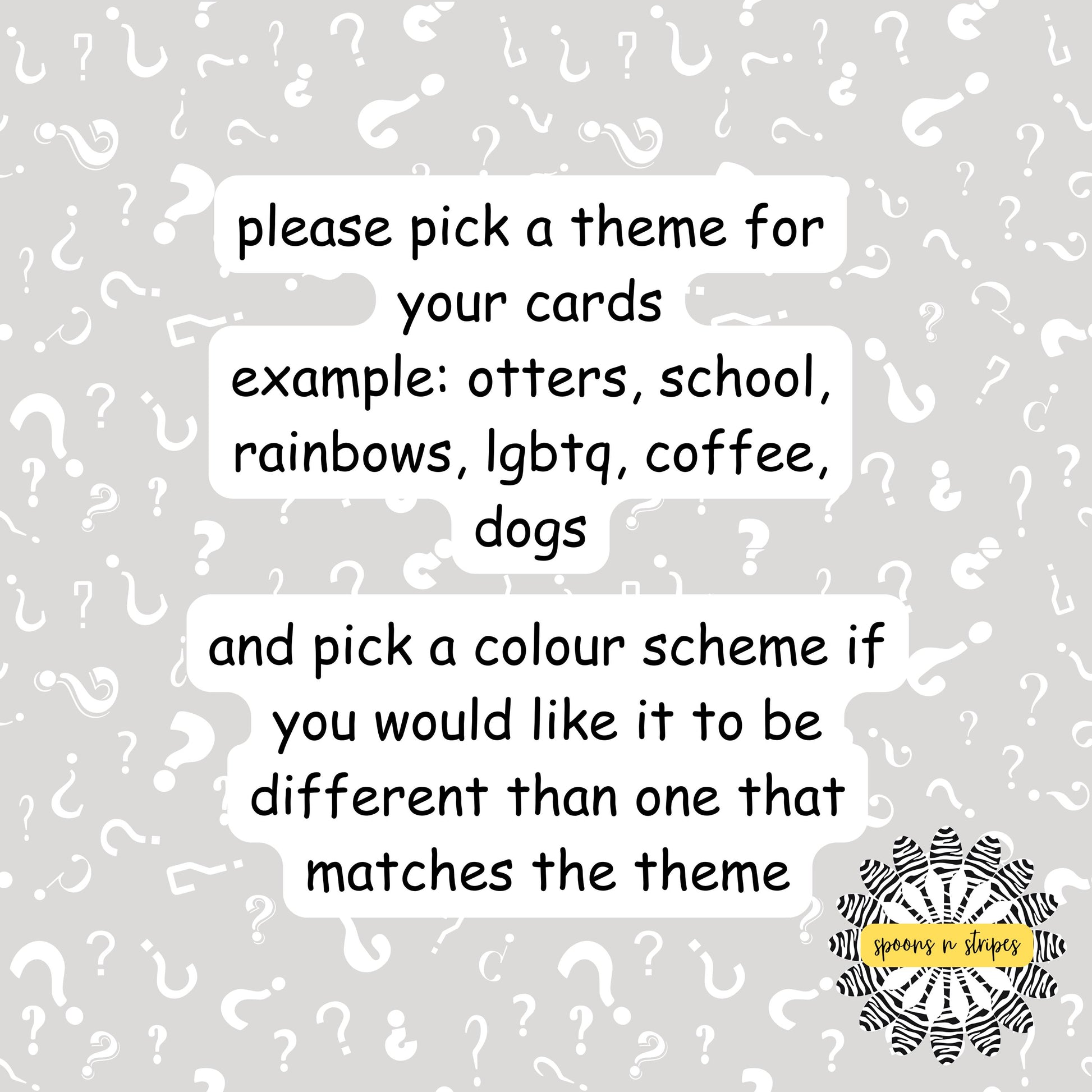 If there any phrases you would like to change, please message me or add the changes to the personalization box. Please choose a theme and a colour scheme (only if you don't want it to match)