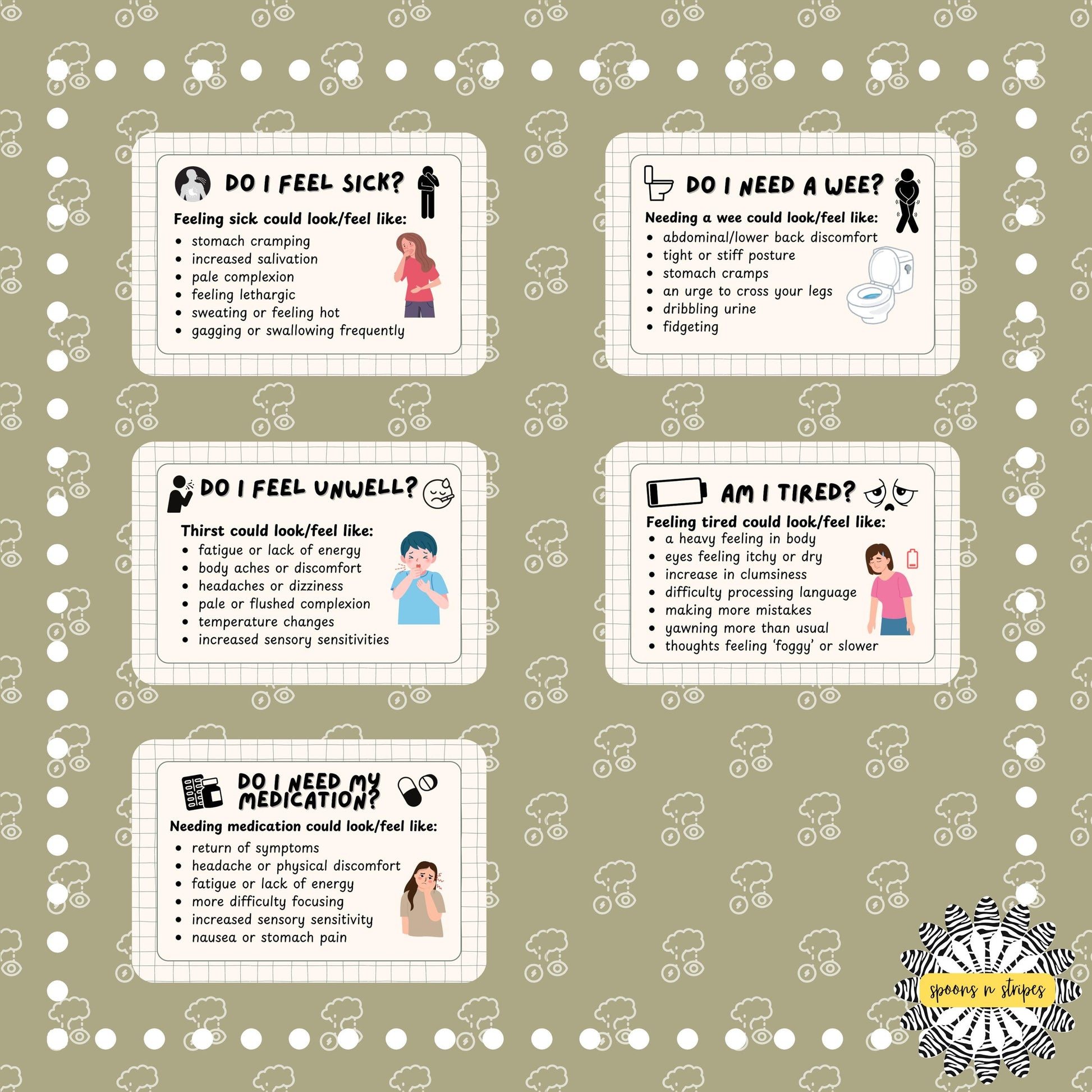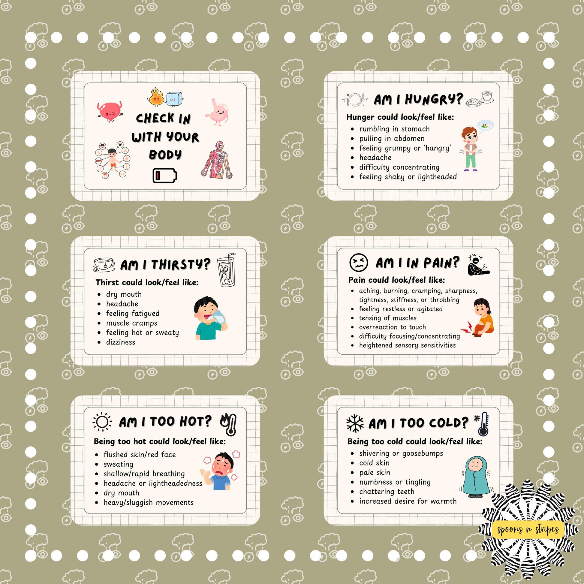 11 communication cards for adults and children highlighting interoceptive issues and needs. this pack is designed to help people who struggle to recognise or understand the cues they may receive from their body. when a sensation arises you can look at your cards and run through the list of sensations to work out what you might be feeling.