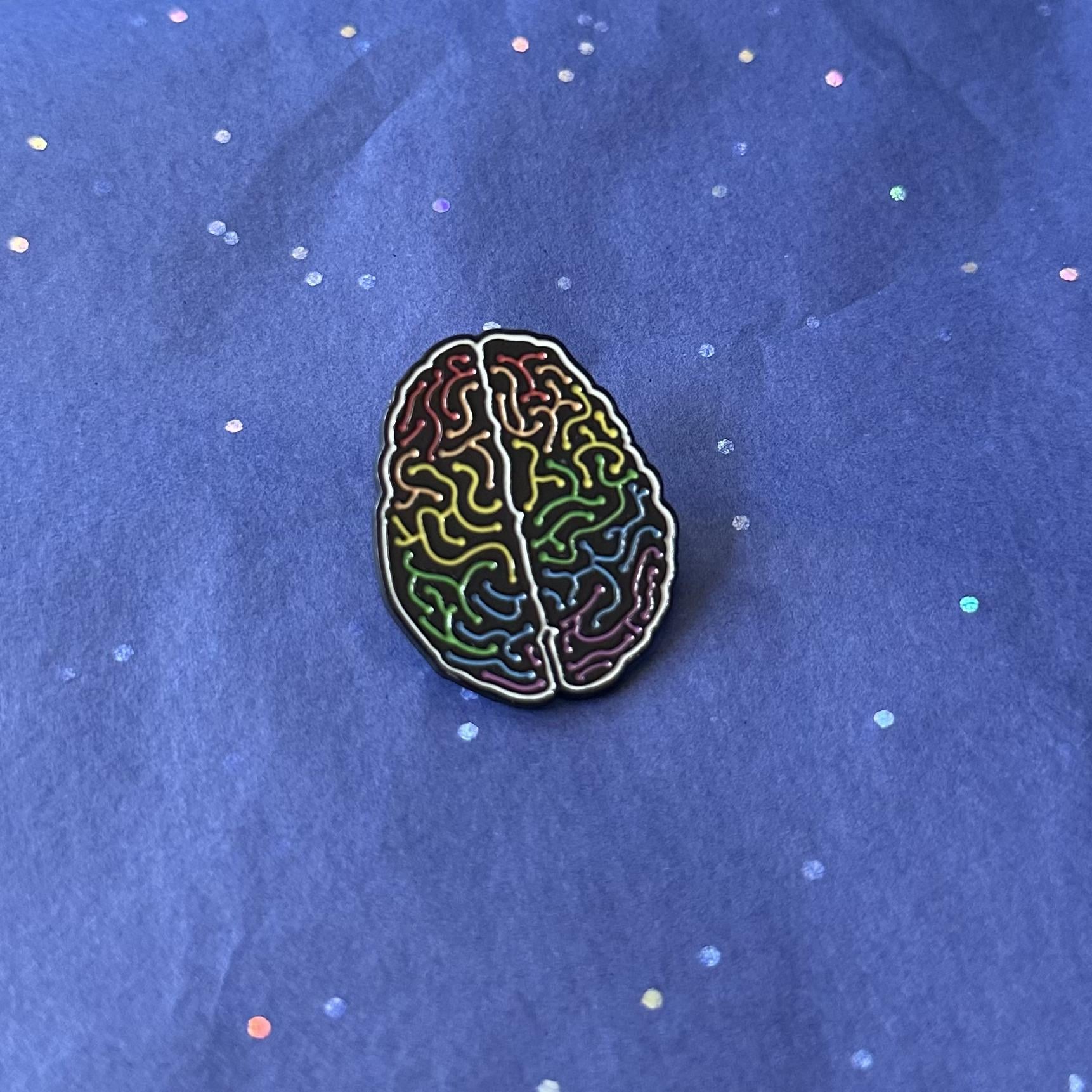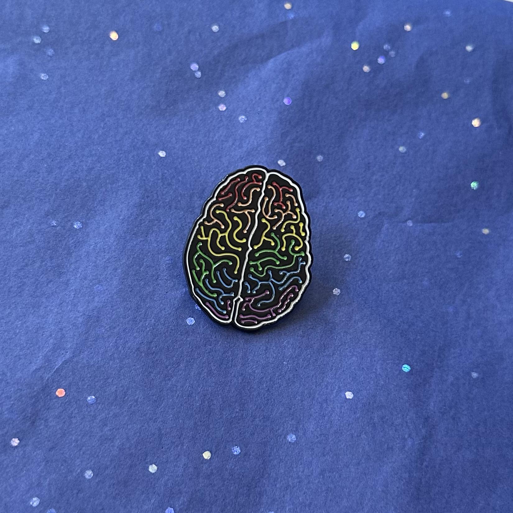 rainbow brain enamel pin, perfect for putting on jackets, lanyards and bags