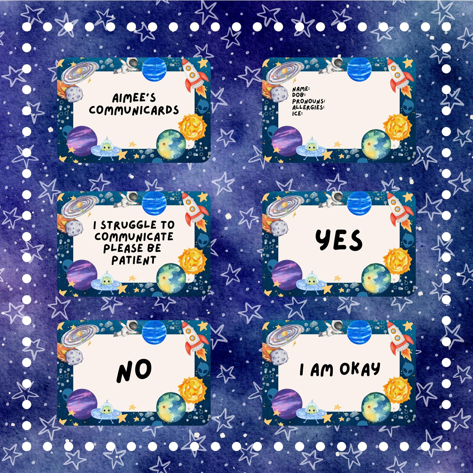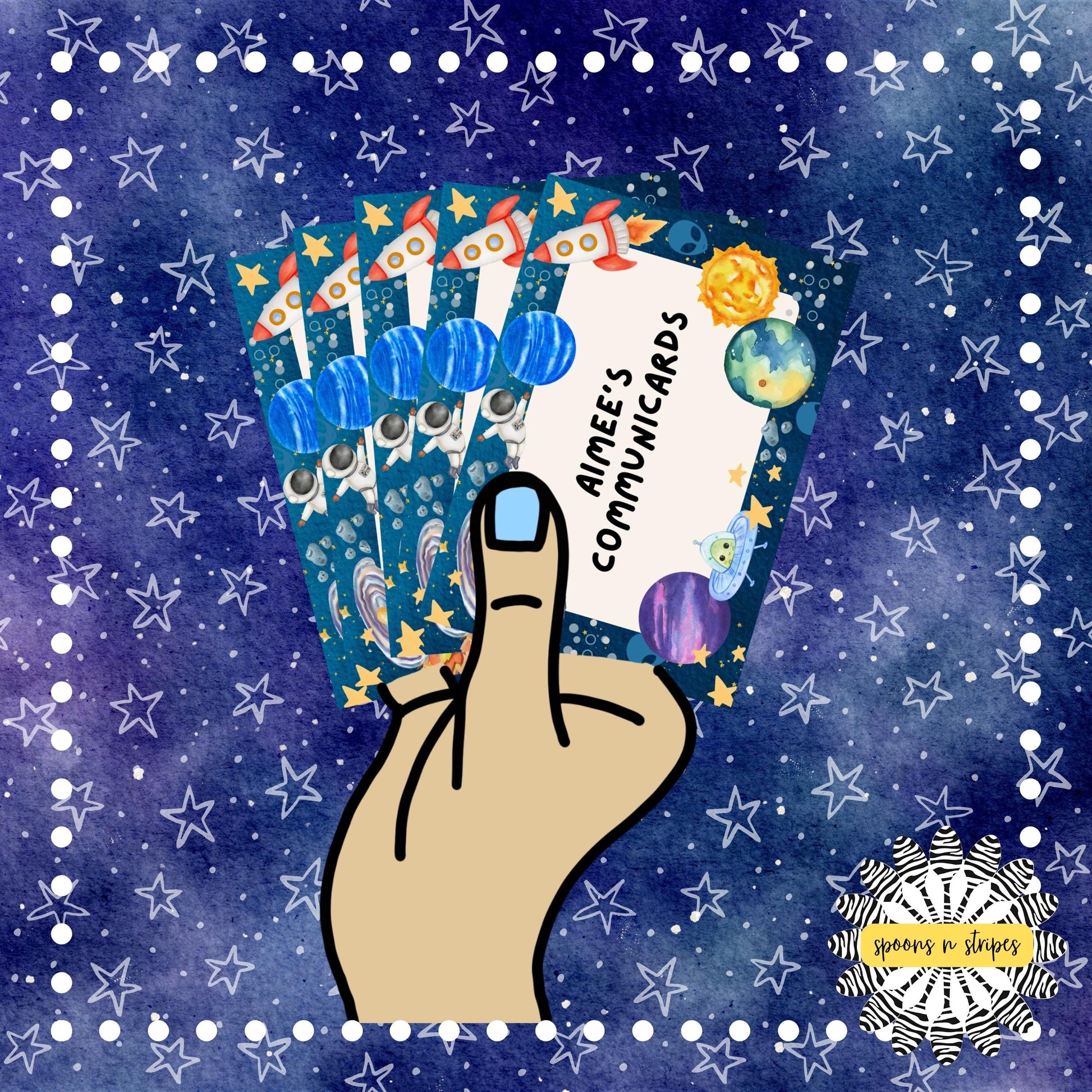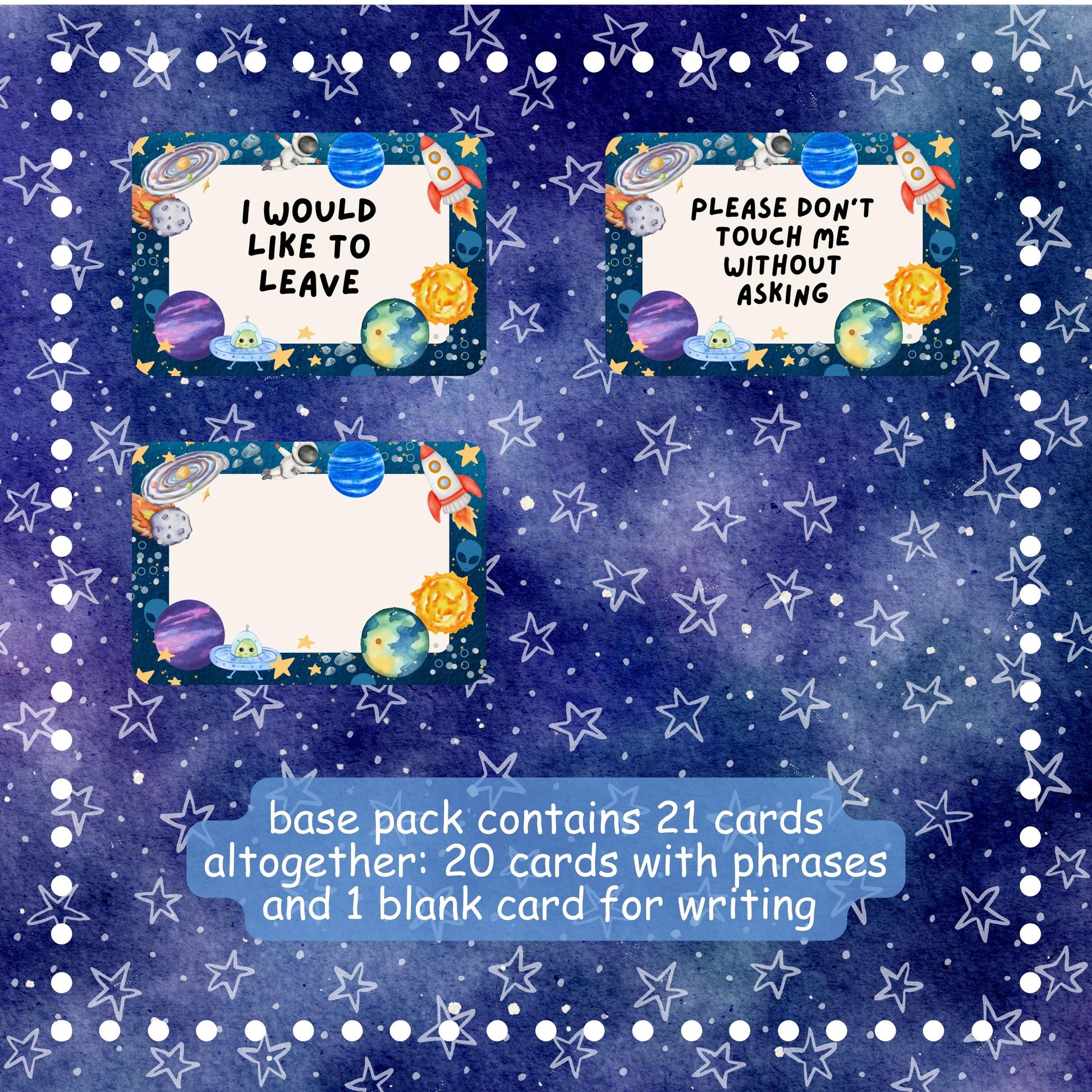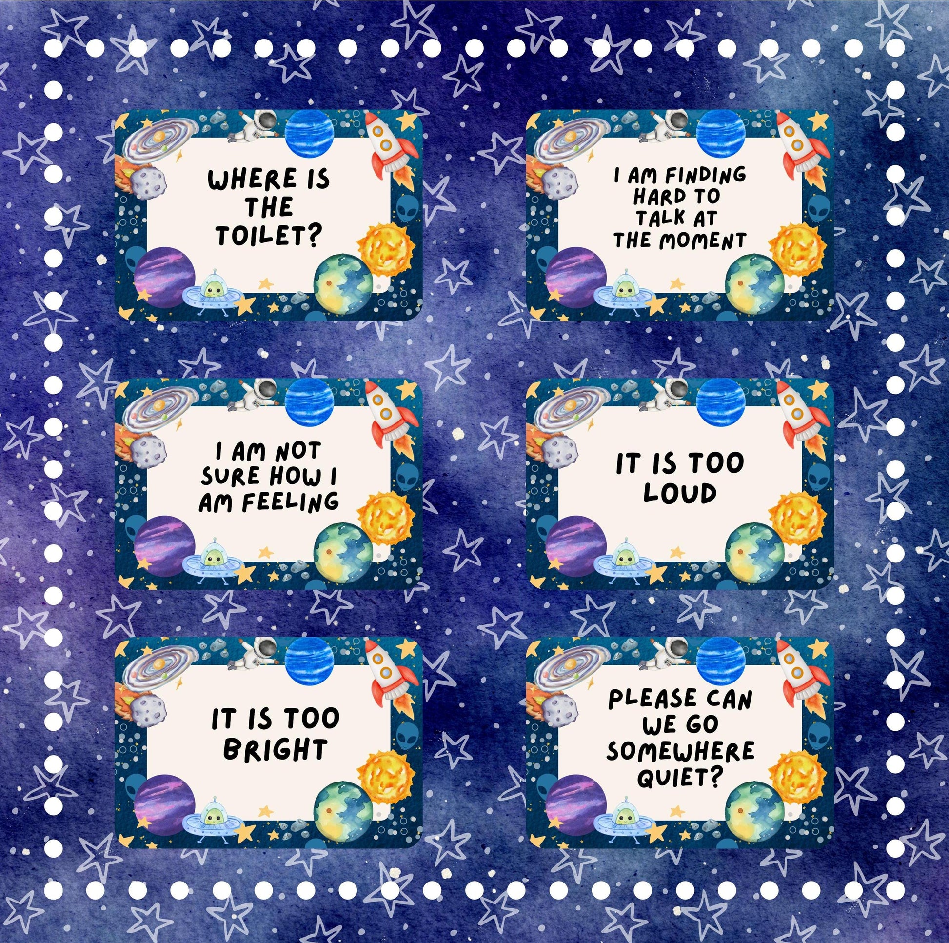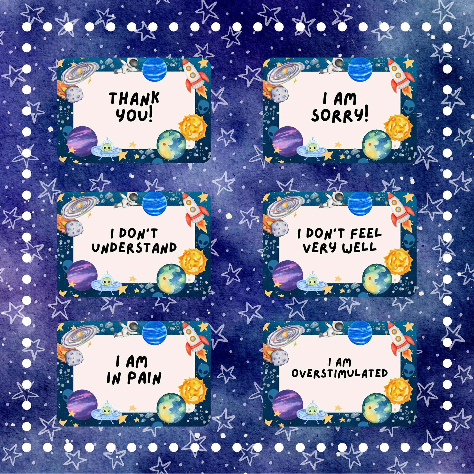 21 beautiful space-themed communication cards for adults and children who struggle with communication.