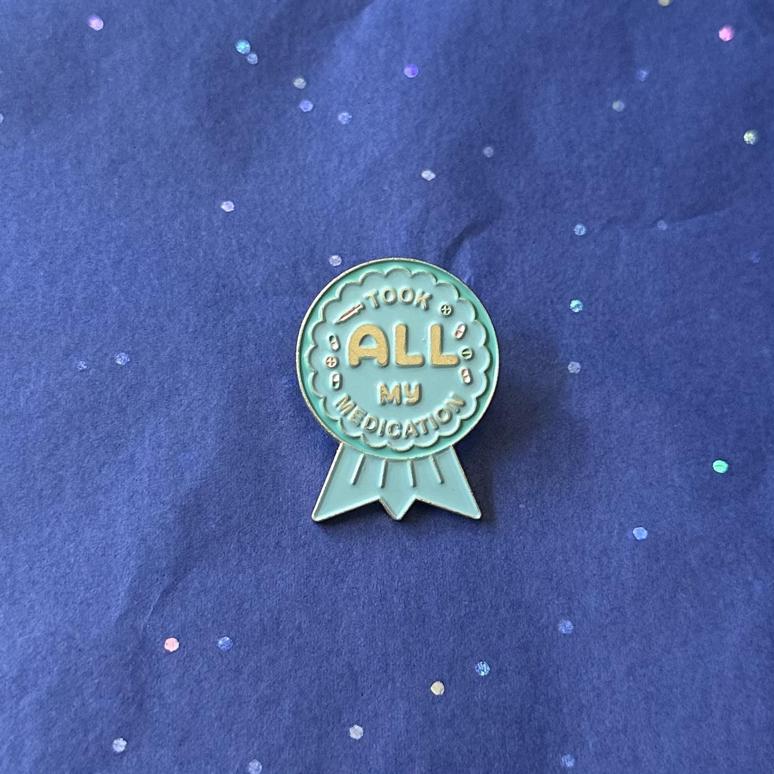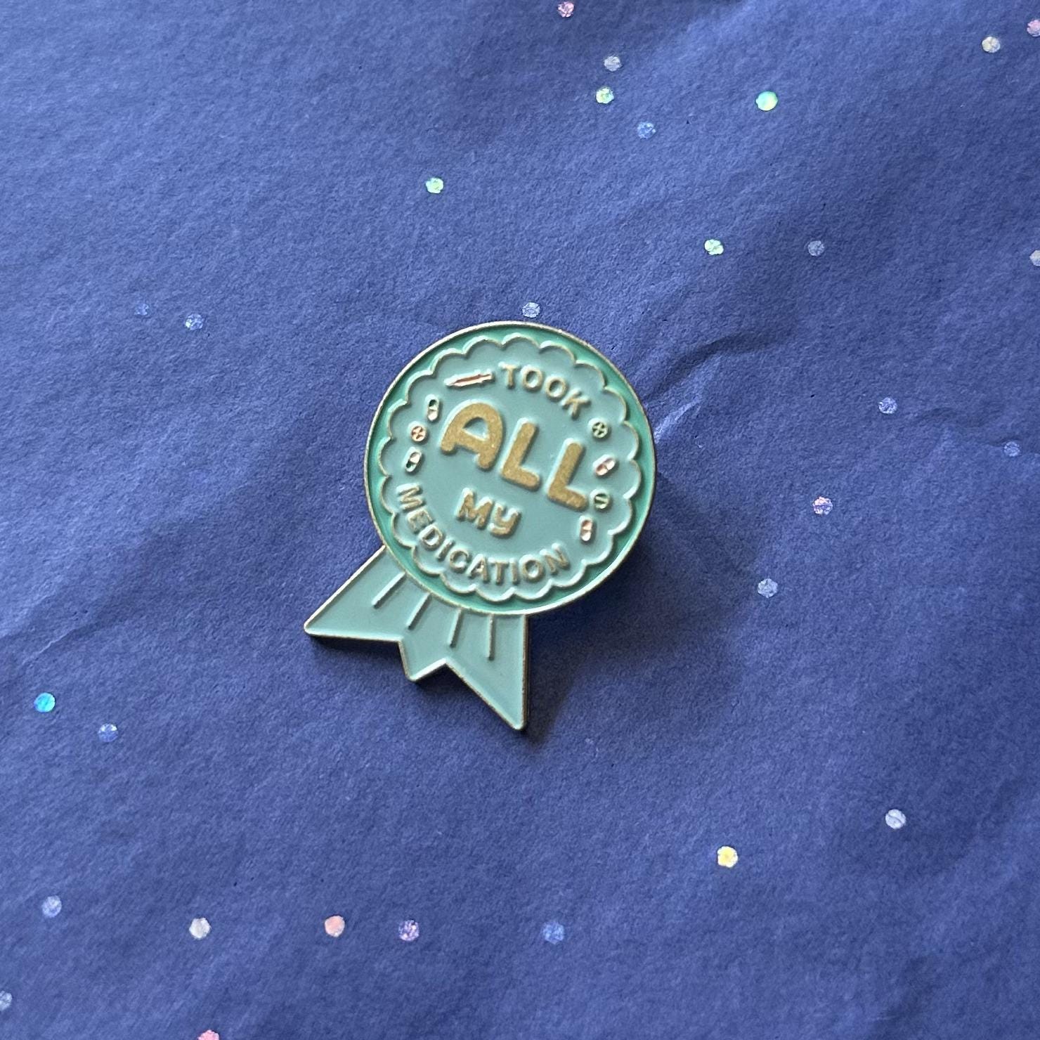 'took all my medication' enamel pin, perfect for putting on jackets, lanyards and bags